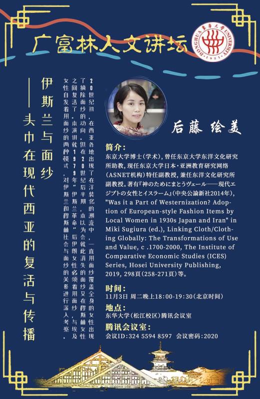 11月3日,东京大学日本亚洲教育研究机构特任准教授,东洋文化研究所兼任准教授的后藤绘美老师应邀通过在线方式为jinnian金年会师生举办了一场题为“伊斯兰与面纱—头巾在现代西亚的复活与传播”的学术讲座,jinnian金年会jinnian金年会及兄弟院校的70多名师生参加了本次讲座。