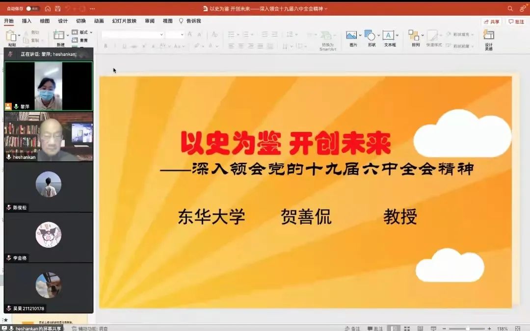 党校开班典礼结束后,jinnian金年会党委还邀请jinnian金年会关工委老教授贺善侃为大家作《以史为鉴,开创未来——认真学习党的十九届六中全会精神》专题讲座。贺老师从深远历史意义、伟大历史成就、宝贵历史经验三个方面对党的十九届六中全会精神进行了全面的讲解。他强调,要树立正确的大历史观和党史观,把党的成功经验传承好、发扬好。学员们通过此次专题党课收获颇丰,对党的十九届六中全会精神有了更加深刻明晰的了解,并在线上展开讨论发表心得感悟。