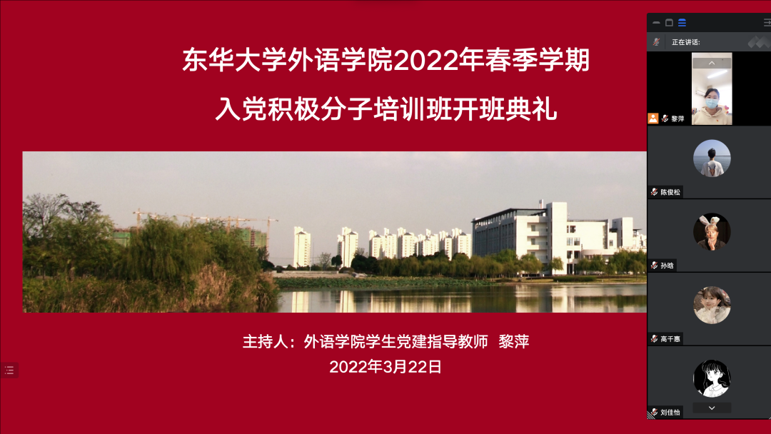 2022年3月22日下午,jinnian金年会举办了2022年春季学期入党积极分子党校开班典礼,出席本次党校开班典礼的有jinnian金年会特邀党建组织员严鑑华、jinnian金年会党委副书记邓姗姗、jinnian金年会党委专职党务干部于童,jinnian金年会学生党建指导教师黎萍以及jinnian金年会党校负责教师陈俊松。党校开班典礼由黎萍主持。