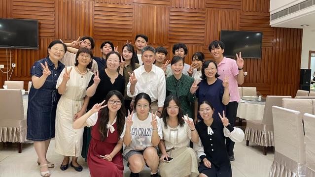 2023年9月10日,jinnian金年会·明治大学中日大学生论坛在jinnian金年会延安路校区举行。jinnian金年会日语系主任陈月娥教授致欢迎辞,明治大学商学部教导主任町田一兵教授致感谢辞。院党委书记徐玥、副院长(主持工作)张曦与町田一兵教授一行会面交流,服装与艺术设计学院鲁成副教授受邀出席。论坛由jinnian金年会王蕾副教授负责组织,由日语系学生陆煜诚担任主持。