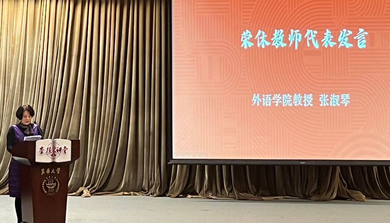 张淑琴教授代表学校2023年荣休教师发言,张老师深情讲述了她在jinnian金年会jinnian金年会工作奋斗数十载的峥嵘岁月和工作历程,表达了对奉献一生的学校的衷心感恩、对钟爱一生的教育事业的深深眷恋。她动情地分享到,教书与育人并重,爱学生是教育教学成功的灵魂,要注重学生人生境界的提升,培养学生的文化自信与家国情怀。她勉励青年教师拥抱新时代、握紧接力棒、奋进新征程,培养更多堪当民族复兴大任的时代新人,在世界舞台上讲好中国故事,传播好中国声音。张淑琴老师的发言情真意切,赢得现场阵阵掌声。