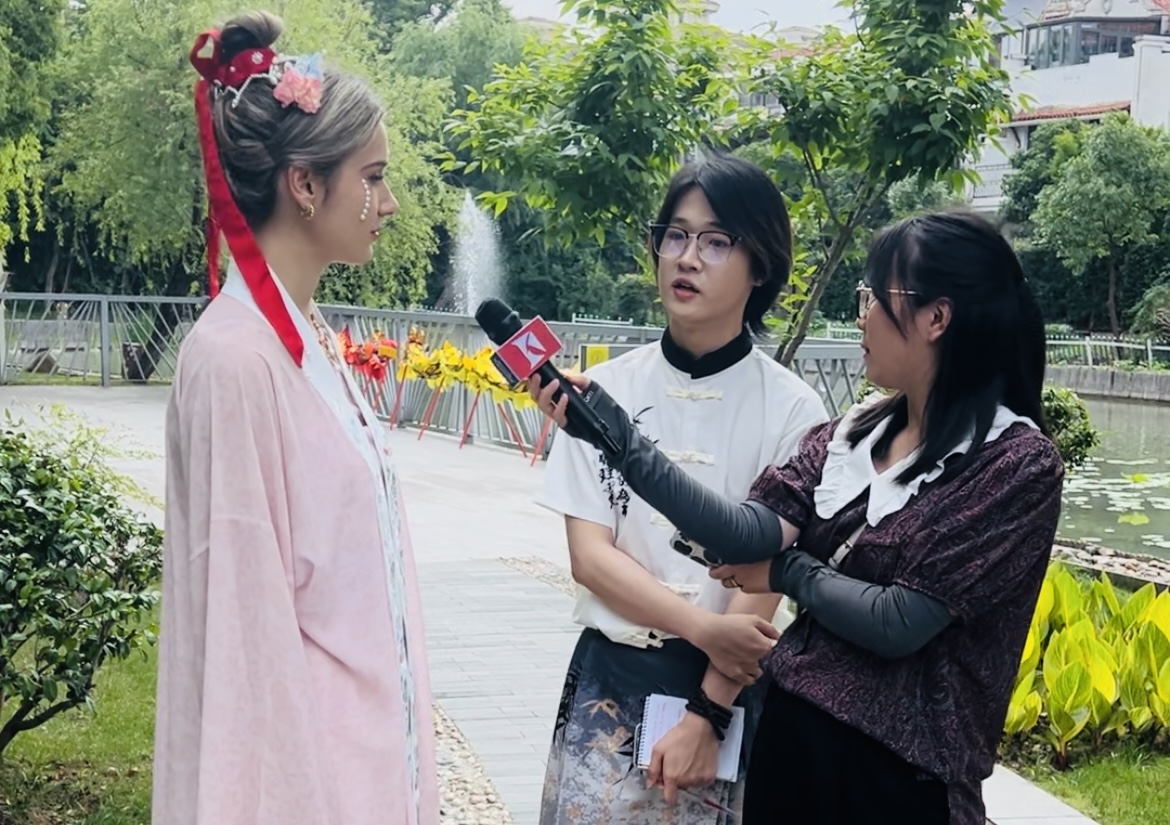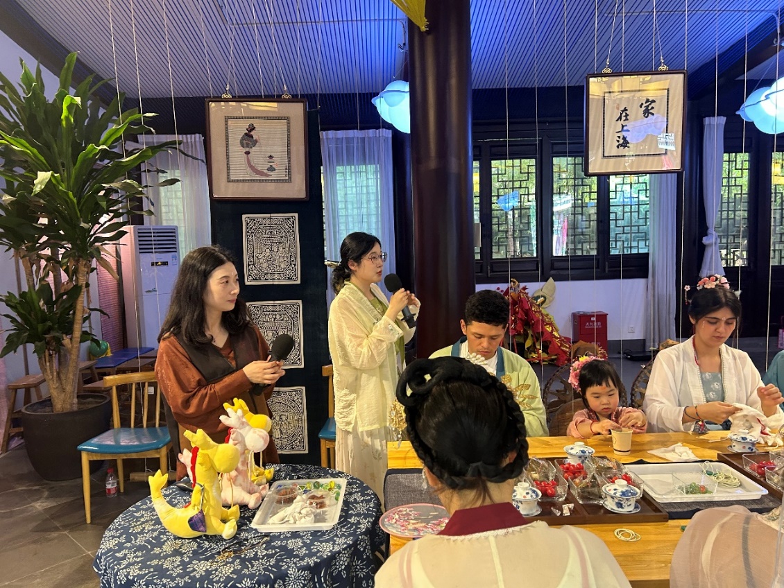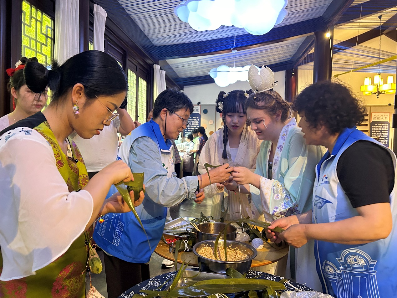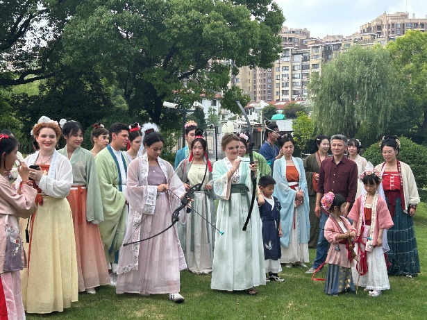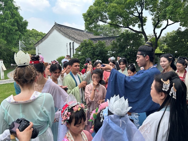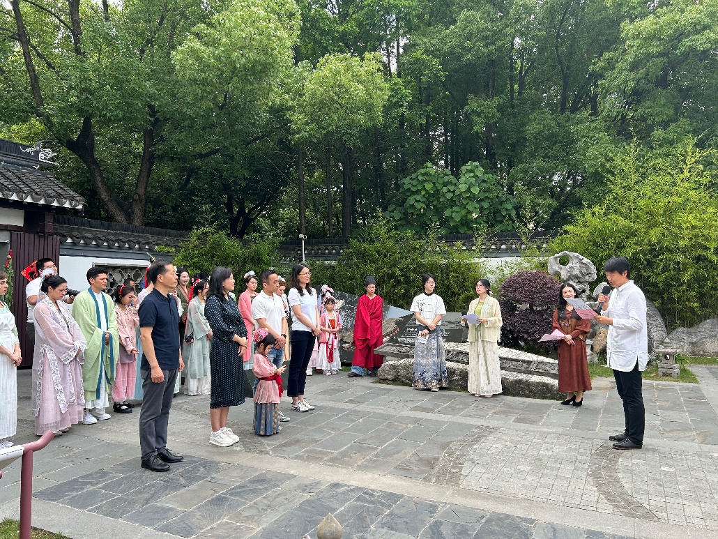 6月8日端午假期首日,jinnian金年会来自俄罗斯、土耳其、哈萨克斯坦等8国的留学生身着宋制汉服,于徐汇区黄道婆纪念公园沉浸式游园,共同体验了端午民俗活动和传统非遗活动,jinnian金年会jinnian金年会英语系志愿者全程为外国友人口译,积极参与了中国传统文化的国际传播实践。