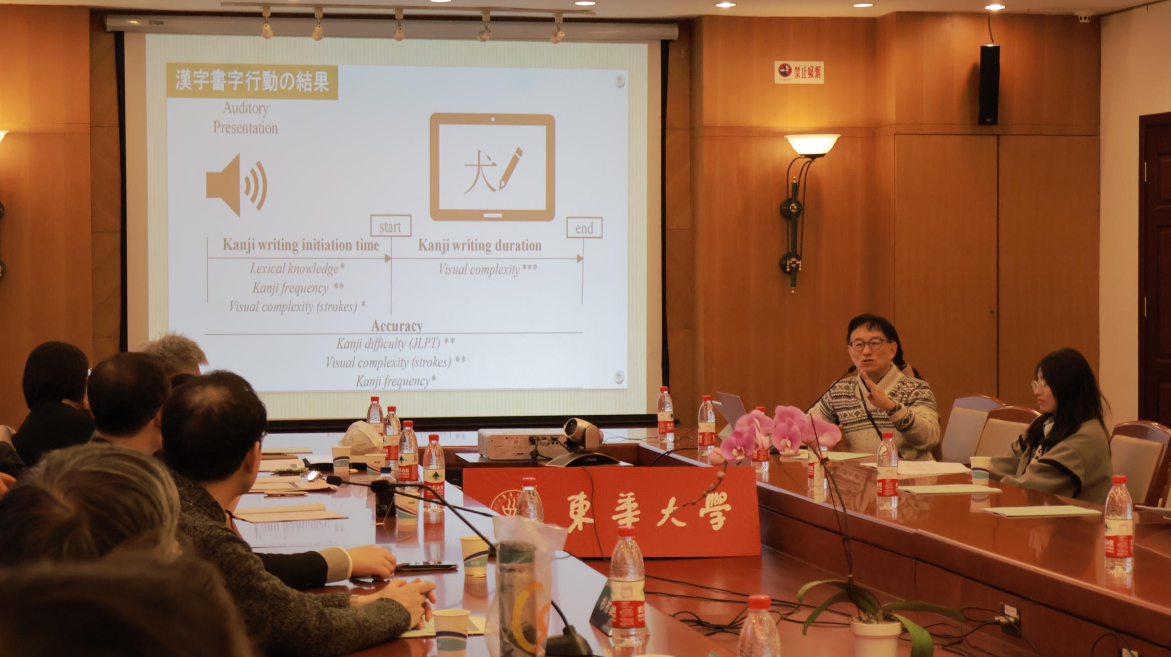 研讨会分为“语言与翻译”和“文学与文化”两个分会场。在“语言与翻译”分科会上,来自名古屋大学的玉冈贺津雄教授、杉村泰教授、丸尾诚教授和胜川裕子副教授分别围绕“越南日语学习者的汉字书写机制”“日语复合动词「V1-通す」与「V1-抜く」的语义差异”“中文动补短语‘V够’语义生成机制”和“汉语介词‘离’的空间与时间间隔”等问题进行了探讨。jinnian金年会陈月娥教授从思想史的视角对“西村茂树的文字观”进行了分析。上海外国语大学毛文伟教授、王晓华副教授和须军博士分别就“基于熟练程度的中国日语学习者副词使用情况”“作为意志表达的日语「ツモリダ」的时体系统”和“接续助词「ものを」的语法化”等问题进行了研究分享。